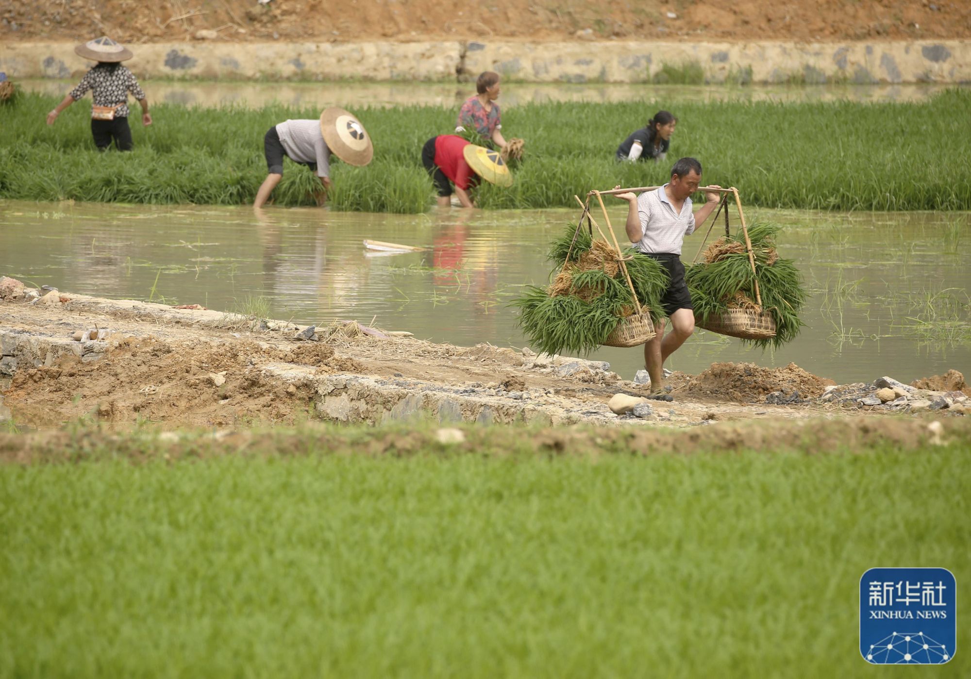 6月7日,村民在贵州省铜仁市玉屏侗族自治县新店镇沙水坪村的田间运秧。新华社发(刘德军摄)