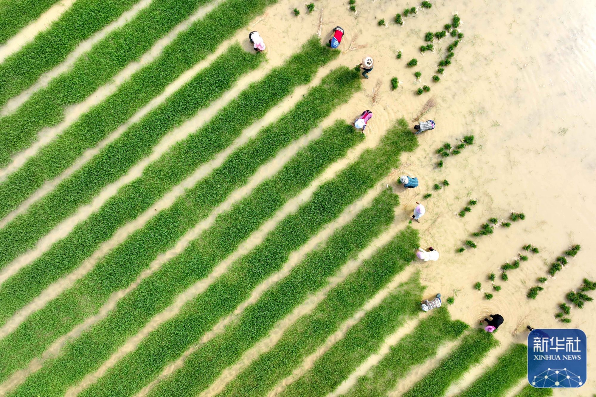 6月7日,村民在贵州省黔东南苗族侗族自治州岑巩县大有镇腊恰畈村整理秧苗(无人机照片)。新华社发(万再祥 摄)