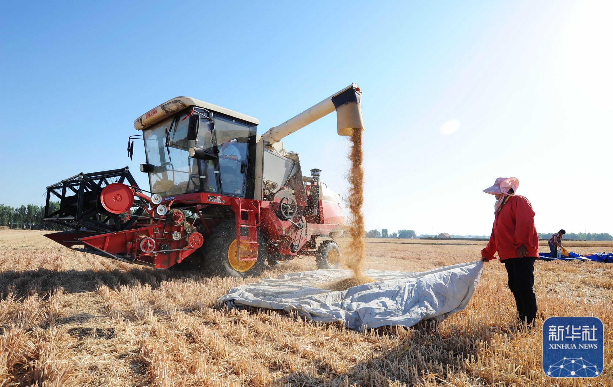 6月7日,在山东省滕州市鲍沟镇宋庄村,农民趁着晴好天气收获小麦。新华社发(李志军 摄)