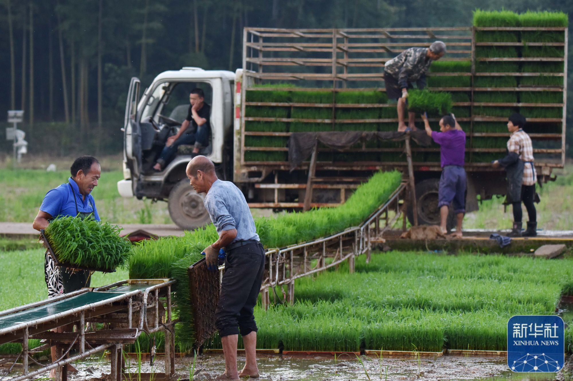 6月7日,浙江省武义县王宅镇仁村育秧工厂为农户装车运送水稻秧苗。新华社发(张建成 摄)
