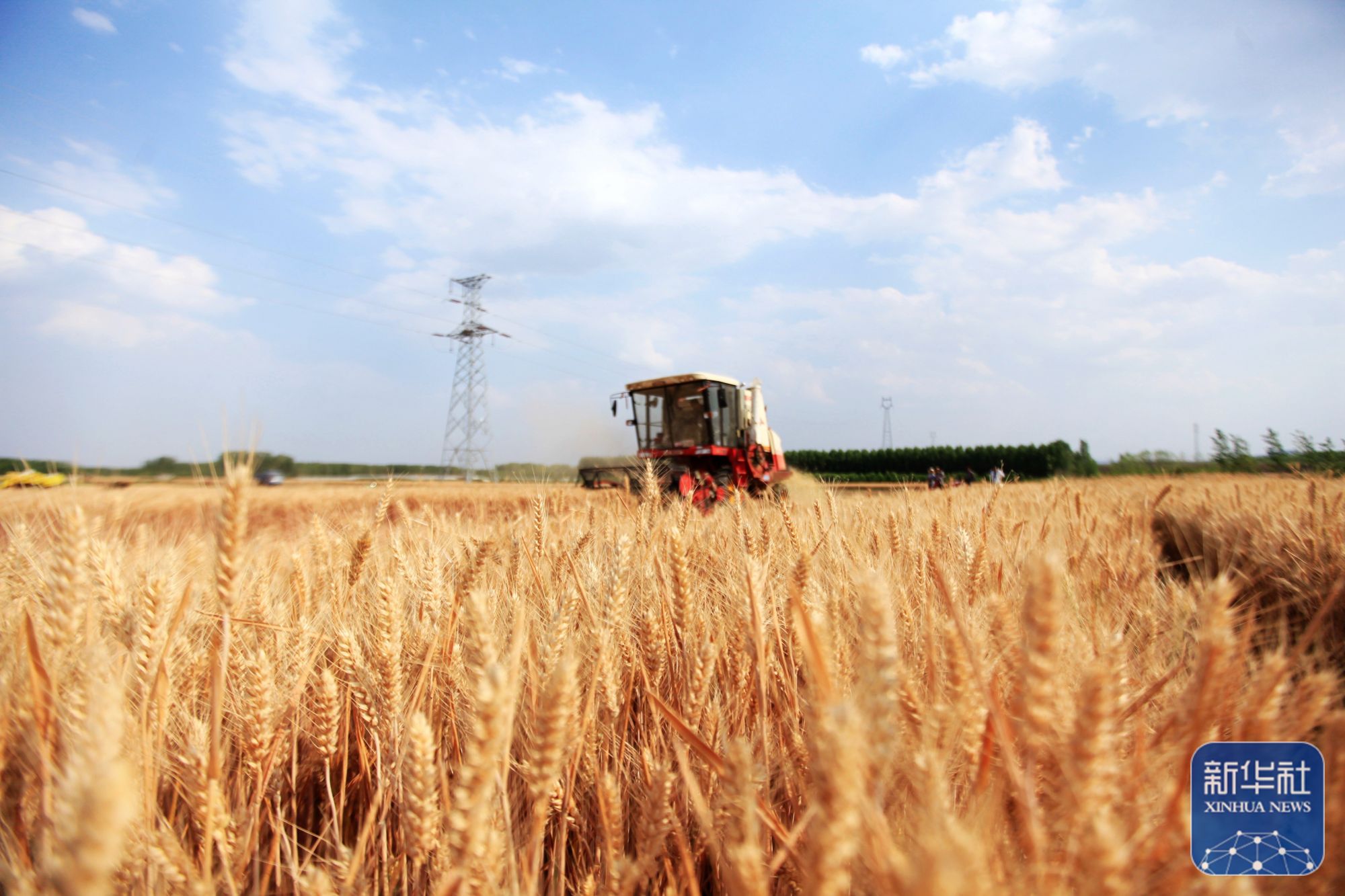 6月7日,在山东省临沂市平邑县地方镇大广良村,农机手驾驶收割机在田间收割小麦。新华社发(武纪全摄)