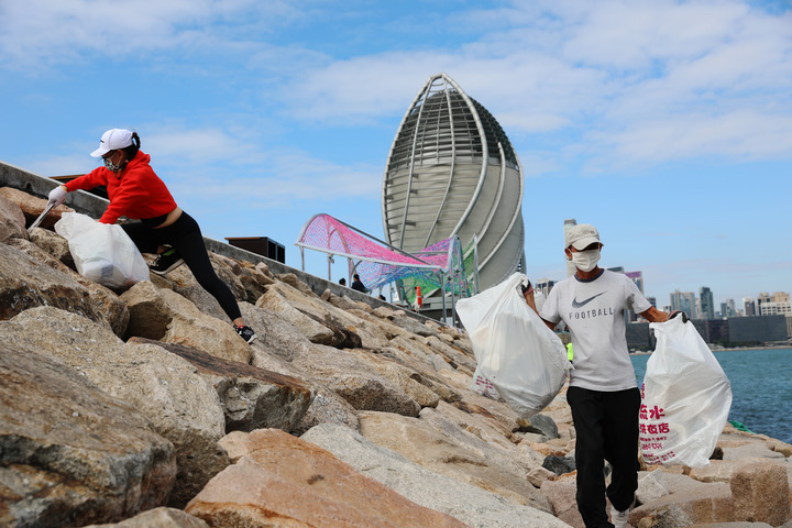 2021年12月7日,义工在香港海边捡垃圾。新华社记者吴晓初 摄
