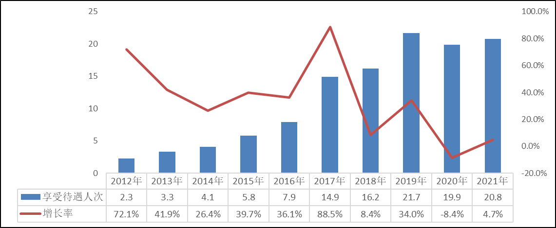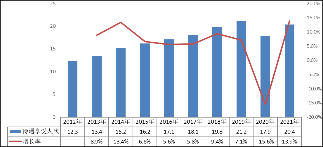 3.待遇享受。2021年,参加职工医保人员享受待遇20.40亿人次,比上年增长13.9%。其中:普通门急诊17.23亿人次,比上年增长14.5%;门诊慢特病2.58亿人次,比上年增长10.6%;住院0.59亿人次,比上年增长11.8%。