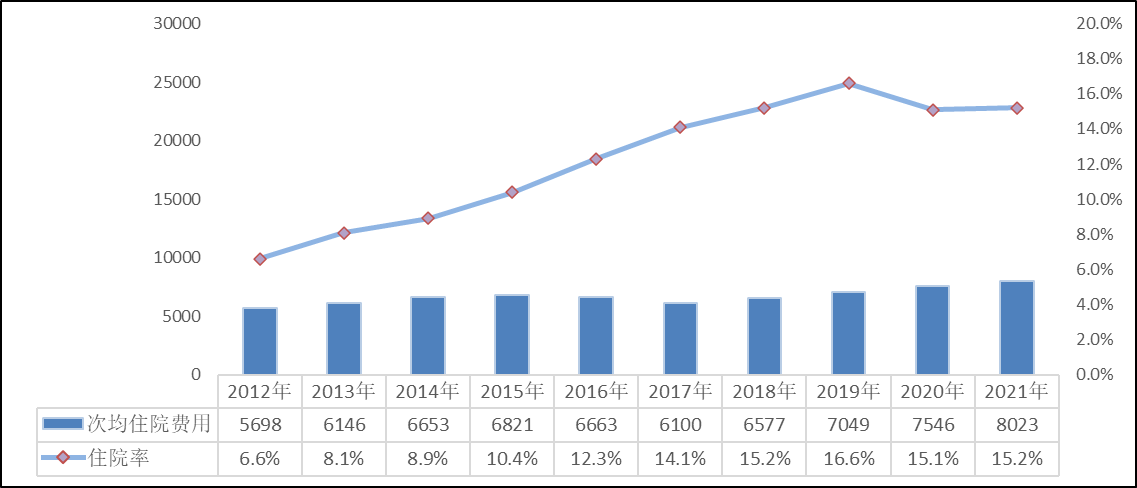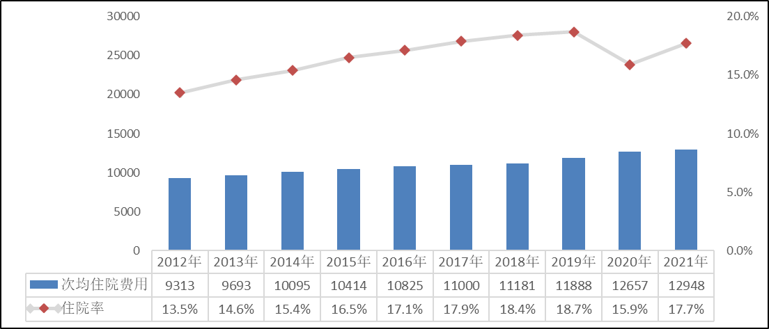 2021年,职工医保参保人员住院率17.7%,比上年增长1.8个百分点。其中:在职职工住院率为9.9%,比上年增长1.3个百分点;退休人员住院率为39.5%,比上年增长3.5个百分点。全国职工医保次均住院费用为12948元,比上年增长2.3%。其中在三级、二级、一级及以下医疗机构的次均住院费用分别为15588元、9284元、7415元,分别比上年增长-0.5%、2.1%、12.6%。次均住院床日10.0天,同比减少0.7天。