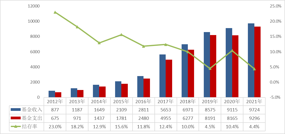 2.基金收支。2021年,居民医保基金收入9724.48亿元,支出9296.37亿元,分别比上年增长6.7%、13.9%。2021年,居民医保基金当期结存428.10亿元,累计结存6716.58亿元。2021年,居民医保人均筹资889元。