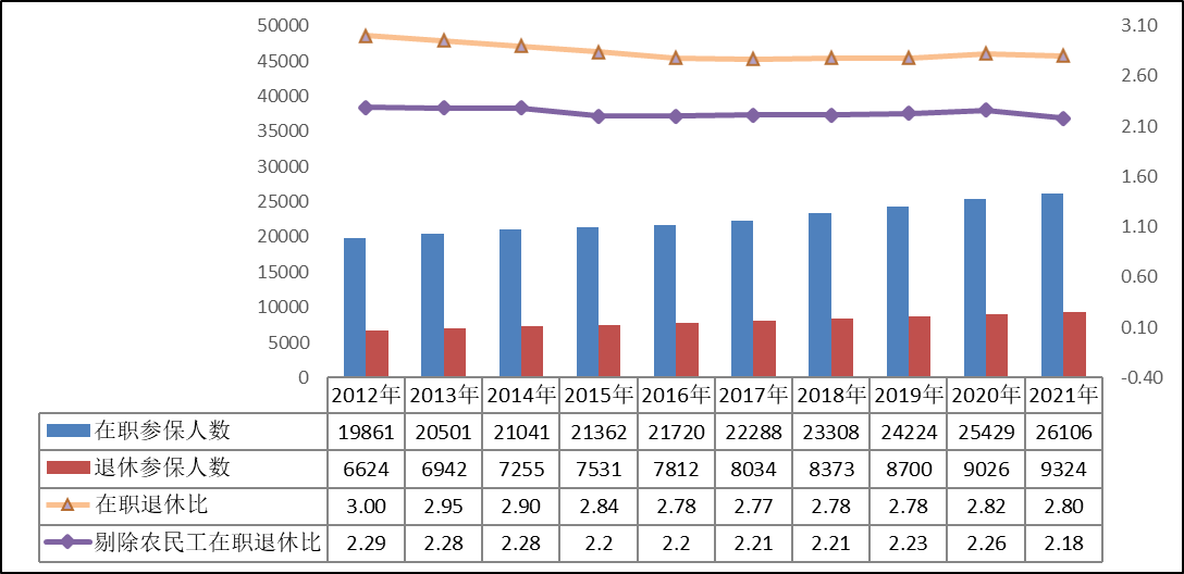 1.参保人数。截至2021年底,职工医保参保人数35431万人,比上年增加976万人,增长2.8%,其中,在职职工26106万人,比上年增长2.7%;退休职工9324万人,比上年增长3.3%。在职退休比为2.80,较上年下降0.02。
