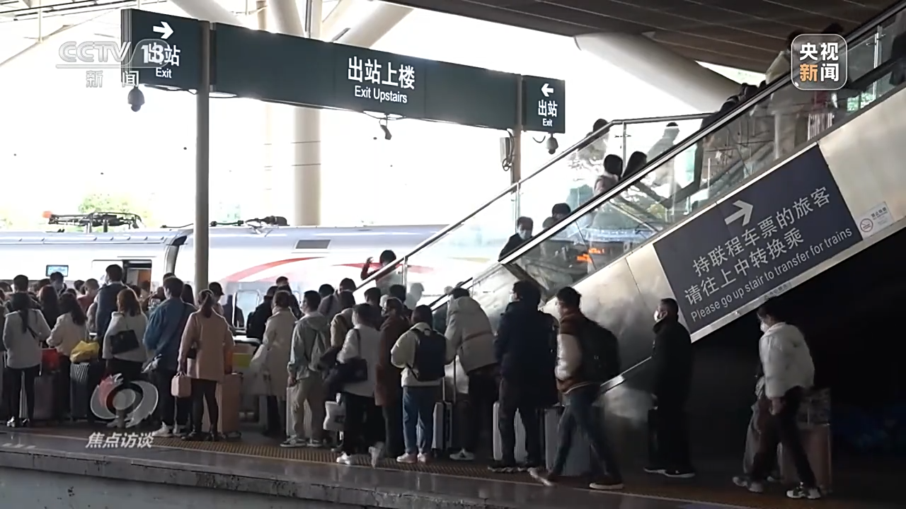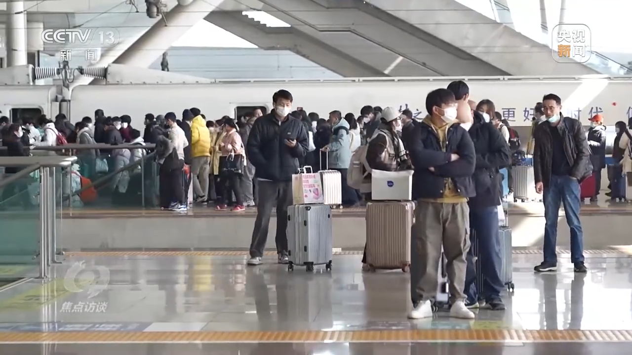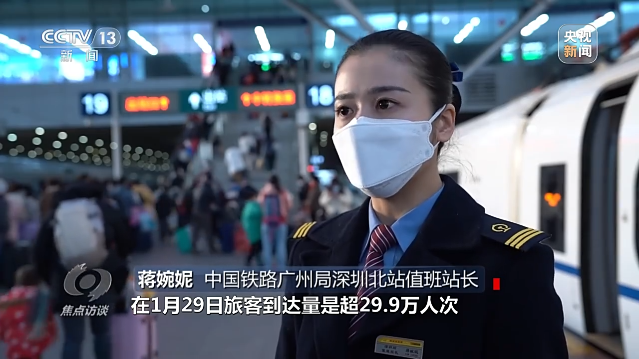 中国铁路广州局深圳北站值班站长 蒋婉妮:1月29日旅客到达量超29.9万人次,预计春运期间在元宵节之前,深圳铁路部门也会持续加大运力投入,将增开列车513列,其中返岗务工专列35列,还有71列夜间高铁到达深圳地区。