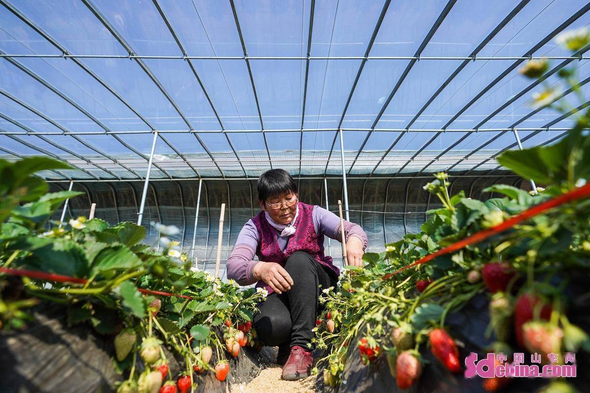 山东省邹平市西董街道南石村老梁家草莓合作社大棚内,农民在进行疏花管理。