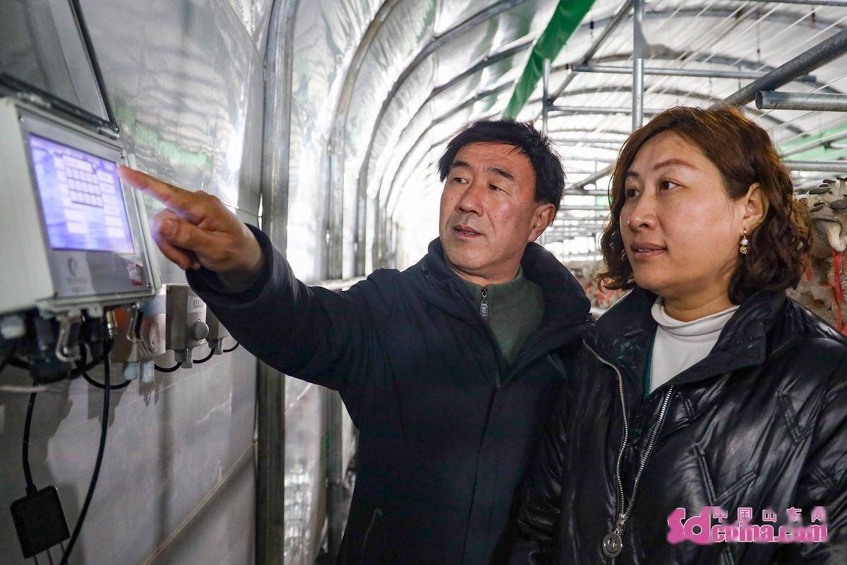 山东省邹平市明集镇牛家村食用菌大棚内,技术人员在查看大棚生产控制设备。