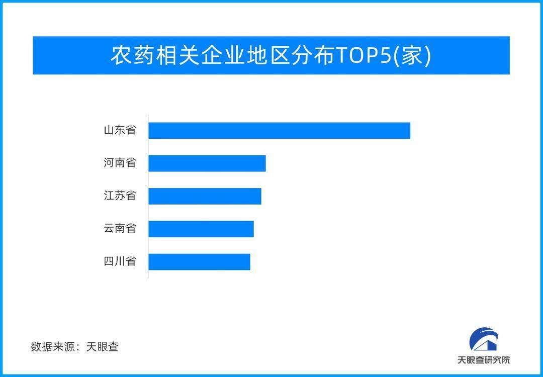 从农药方面来看,天眼查数据显示,截至目前,我国拥有95.8万余家农药相关企业。其中,2022年新增注册企业9.3万余家,增速达10.8%。从地域分布来看,山东、河南以及江苏三地相关企业数量最多,分别拥有13.6万余家、6.1万余家以及5.9万余家。