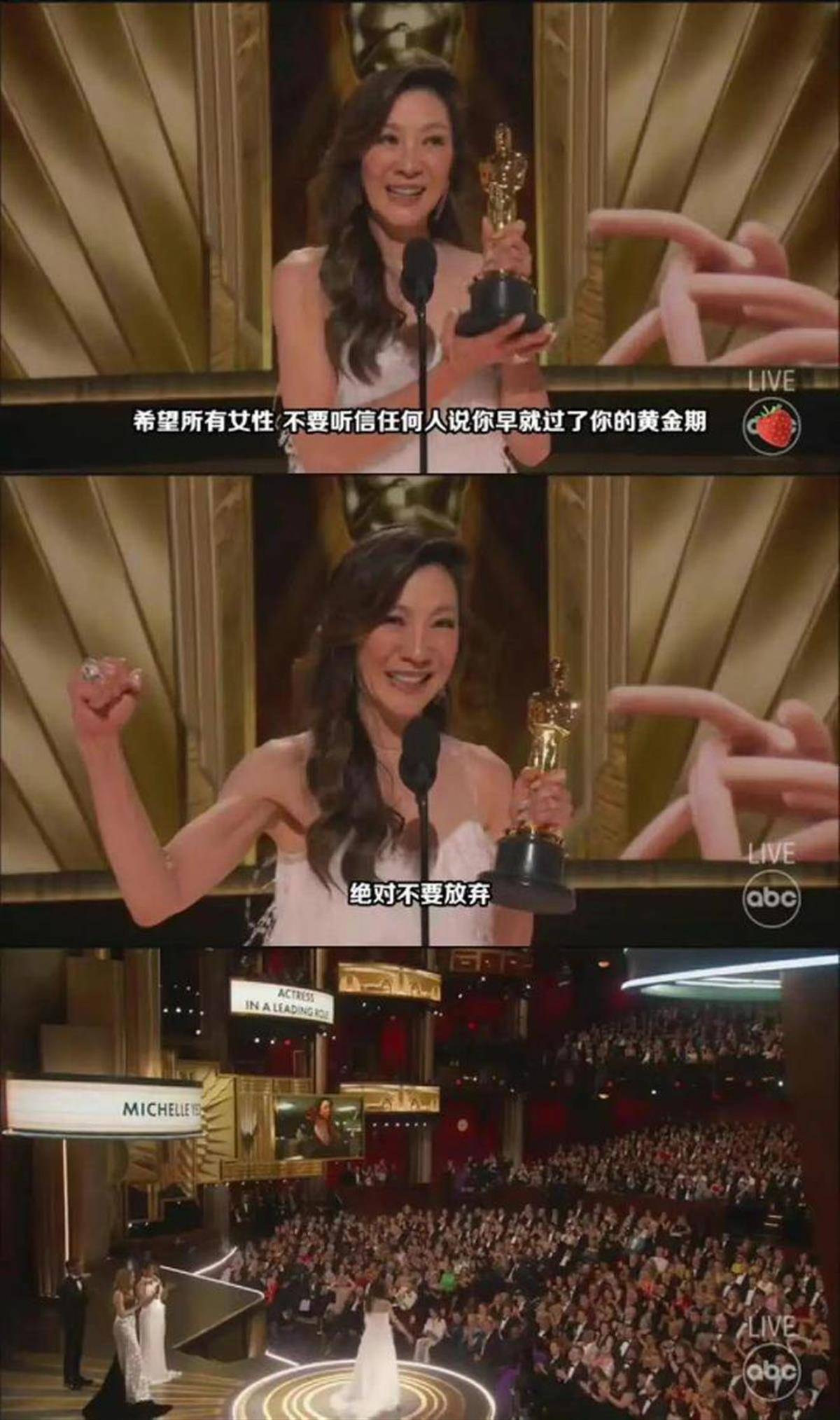 杨紫琼获得奥斯卡影后的作品《瞬息全宇宙》,讲述的就是一个平凡的家庭主妇,通过多元宇宙穿梭汲取能量、拯救世界的故事,打破中年女性困境,彰显女性力量的主题非常明显,也成为影片最大的魅力点之一。而杨紫琼作为一个61岁的亚裔女性,在很多人所认为的“迟暮之年”拿到奥斯卡影后,本身就是女性励志的榜样,她在领奖台上激励女性永不言弃,追求梦想,令人感受,意义深远。