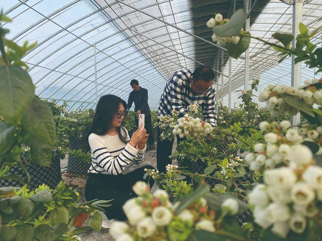 吕欣(前)在拍照记录蓝莓生长状况 尹思源 摄