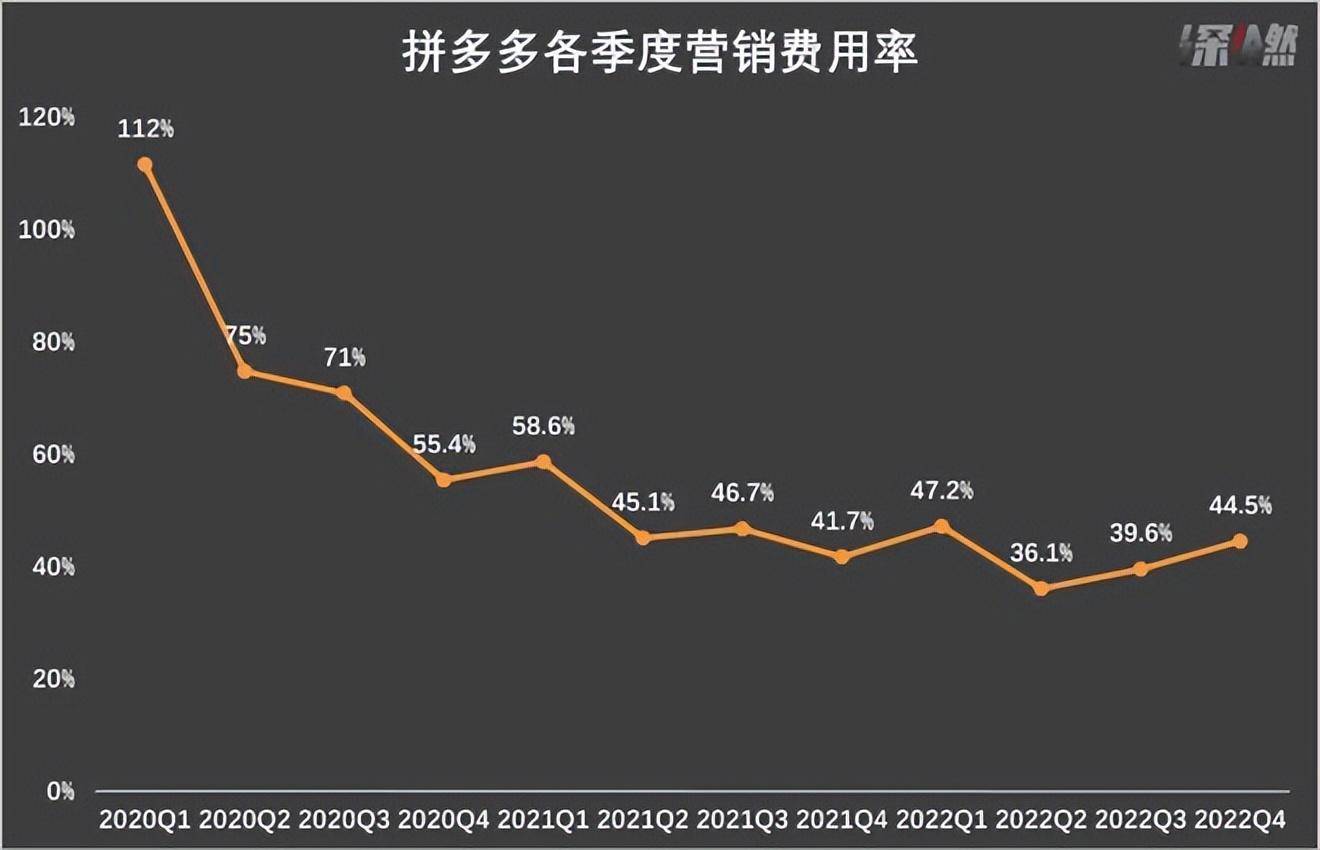 2020年以前,拼多多的营销费用一度超过公司总收入,高峰时营销费用率甚至达到112%。后来,营销费用率开始下降,2021年降至48%,2022年进一步降至42%。在2022年的二三季度,这个比例降到了40%以下。