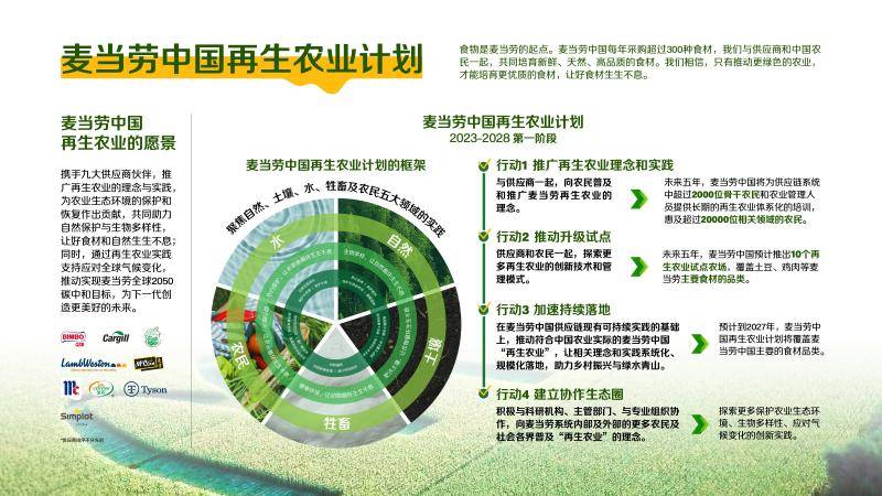 “麦当劳中国再生农业计划”聚焦自然、土壤、水、牲畜及农民五大领域,实现再生农业理念和实践的系统化、规模化推广和落地,为农业生态环境的保护和恢复作出贡献,共同助力自然保护与生物多样性,让好食材和自然都能生生不息;同时,通过再生农业实践支持应对全球气候变化,推动实现麦当劳全球2050碳中和目标,助力绿色低碳农业加速发展。该计划将在2023-2028年的第一阶段内将采取四大行动,包括:推广与普及麦当劳中国再生农业的理念、推动麦当劳中国再生农业的升级试点、推动符合中国农业实际的麦当劳中国再生农业持续落地和建立麦当劳中国再生农业的协作生态圈。