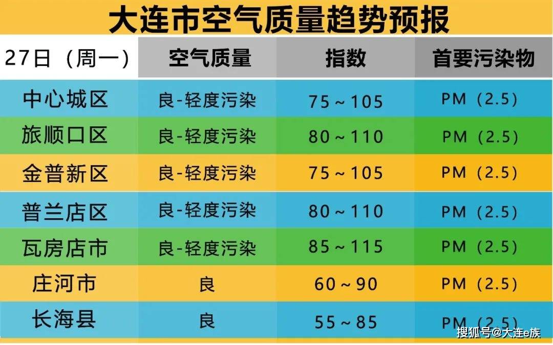 西部沿海、南部沿海偏北风5到6级转偏南风5到6级,东部沿海偏北风6级、阵风7级26日中午转西南风5到6级,大连市各县市区偏北风4到5级转西南风4到5级。
