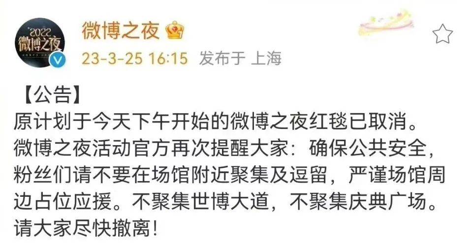 然而,到了下午4点多,红毯还是被取消。微博之夜官方微博也发文表示:请大家不要聚集,尽快撤离!