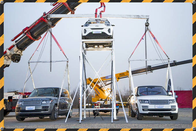 在确定2台路虎揽胜行政版完全离地,且环境安全之后,我们控制吊车放松吊索,此时,近5.5倍自身重量的重力负荷再次压在了奇瑞小蚂蚁的身上。最坏的现象终究没有出现,奇瑞小蚂蚁作为支点,稳稳撑住了整套杠杆系统,直到我们将之撤下,其车身依然坚固如初,再次顺利完成挑战。
