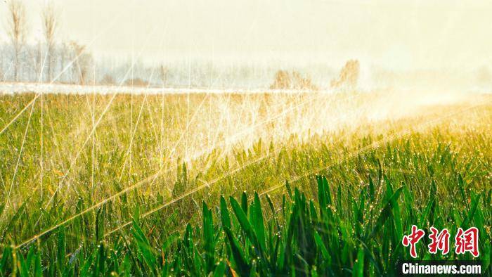 图为喷淋设备正在给冬小麦浇返青水。 张子斌 摄