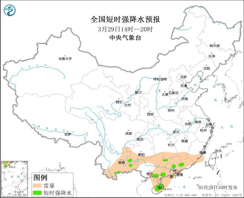 预计3月29日14时至30日08时,云南东部和南部、广西东北部和东南部、广东中部和西南部、海南岛中北部等地的部分地区将有短时强降水天气,小时雨量20-40毫米,局地可达50毫米以上。