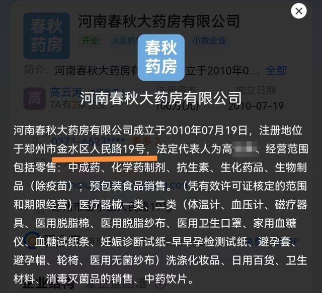 记者调查了解到,该“春秋大药房”的全称为河南春秋大药房有限公司,是一家小微企业,经营范围主要是:零售中成药、化学药制剂、抗生素、生化药品、生物制品(除疫苗),预包装食品销售等。
