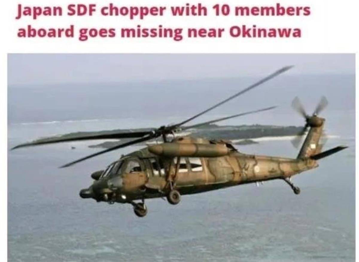 日本防卫省说,这架多用途直升机隶属于陆上自卫队第八师团,从宫古岛基地起飞侦察周边地形,机上共搭载10人,包括第八师团最高长官中将师团长、2名飞行员、2名机械师和其他5名自卫队队员。