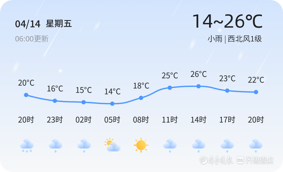 小雨,温度 14~26℃,西北风1级。未来三天最高温度27℃,最低温度8℃。主要以晴天为主,可能伴有降雨天气,温度的也许会有轻微浮动,请注意身体健康。