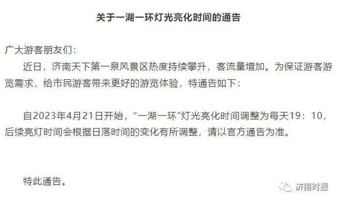 昨天,济南文旅集团旅游开发有限公司发布通告,通告称,自2023年4月21日开始,“一湖一环”灯光亮化时间调整为每天19:10,后续亮灯时间会根据日落时间的变化有所调整,以官方通告为准。这也意味着,作为济南市“一湖一环”景观照明工程的一部分,“网红”超然楼的亮灯时间也将同步调整。