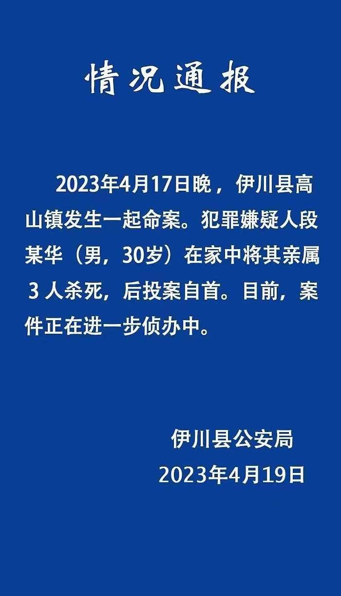 “伊川公安”微信公众号消息,伊川县公安局发布警情通报,4月17日晚,伊川县高山镇发生一起命案。犯罪嫌疑人段某华(男,30岁)在家中将其亲属3人杀死,后投案自首。目前,案件正在进一步侦办中。