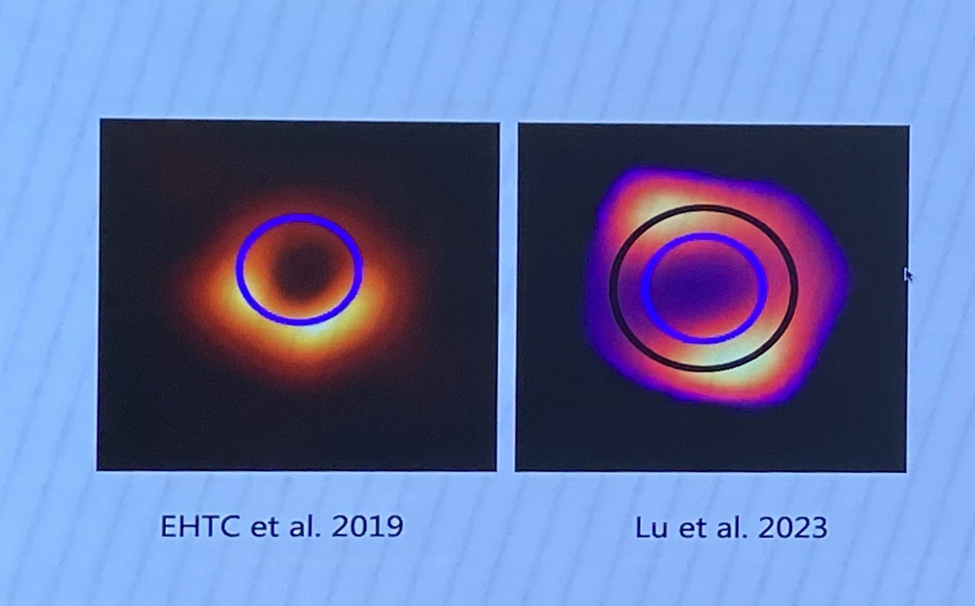 左为2019年4月10日公布的人类历史首张黑洞照片,右为2023年4月26日公布的同一个黑洞的照片,环状结构在3.5毫米波长下变得更大、更厚。