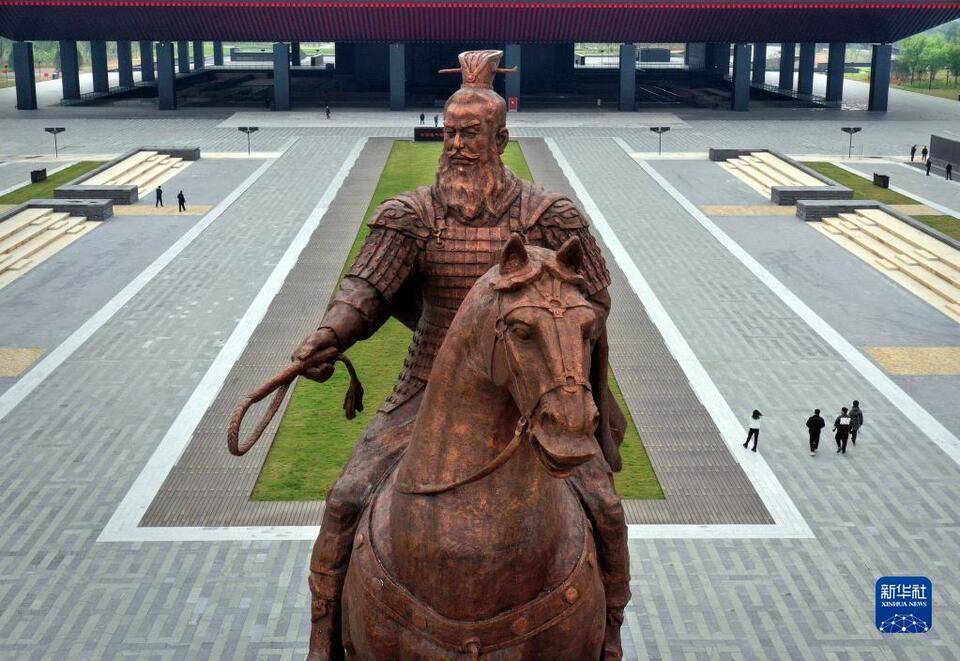 这是4月24日拍摄的曹操高陵遗址博物馆的“魏武挥鞭”塑像(无人机照片)。新华社记者李安摄