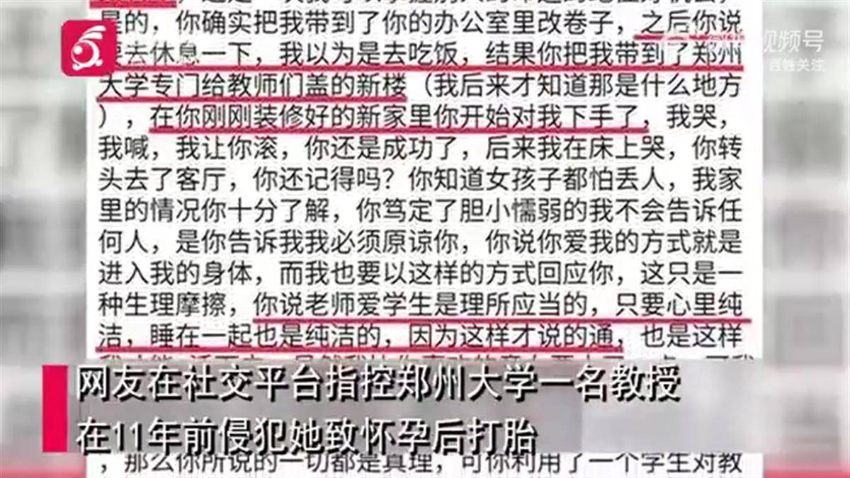 5月9日,一女子发文称自己在11年前遭郑州大学教授王某某PUA长达两年半,遭侵犯致怀孕后被其带去医院打胎。此事引发舆论关注。5月10日晚,记者了解到,郑州大学高度重视此事,已会同多部门展开调查。目前,王某某承认和该女子有不正当关系。但不正当关系保持了多久?是不是PUA、性侵?涉事双方说法不一,仍在调查。(据5月10日上游新闻)