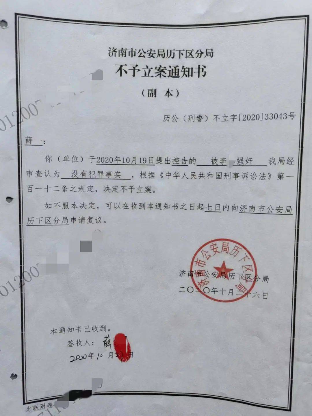 他们之间的性关系是否属于强奸?一开始,当地警方和检察院意见并不一致。2020年10月26日,济南市公安局历下区分局向薛小姐出具的《不予立案通知书》称,就其控告自身被李先生强奸一事,经审查认为“没有犯罪事实”,根据《刑事诉讼法》第一百一十二条之规定,决定“不予立案”。