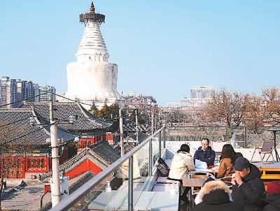 近年来,老字号纷纷开启“新玩法”。图为顾客在位于北京市西城区的老字号白塔寺药店楼顶品尝饮品。