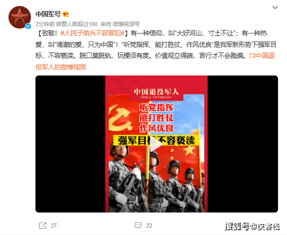 5月16日深夜,中国人民解放军新闻传播中心官方微博“中国军号 ”发文称:“听党指挥、能打胜仗、作风优良”是我军新形势下强军目标,不容亵渎。脱口莫脱轨,玩梗须有度。价值观立得端,言行才不会跑偏。