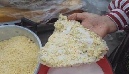 大妈卖的是糯米饭。是中国传统主食之一在南方中国人民生活中占有重要地位,为男女老幼喜爱之食品,各种节日的主食,多为糯米做成的各种食品。糯米含有蛋白质、脂肪、糖类、钙、磷、铁、维生素B1、维生素B2、烟酸及淀粉等,营养丰富。大妈卖的这糯米饭看着不怎么样,很多人都想着没吃过就尝尝,每个人口味都不一样,自然就有喜欢或者不喜欢的。