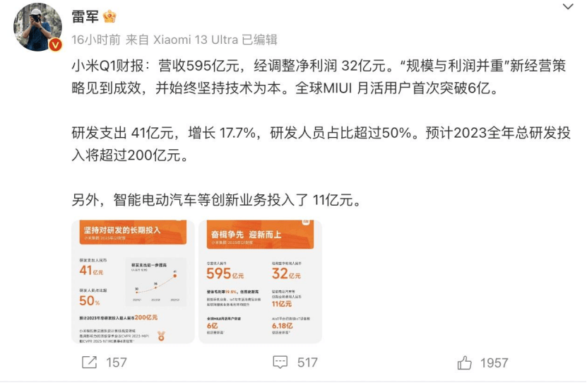 小米集团创始人、董事长兼CEO雷军在社交媒体发布了小米Q1财报,并透露了汽车相关的消息。小米集团一季度研发支出为41亿元,增长17.7%,其中智能电动汽车等创新业务共投入11亿元。雷军称,“规模与利润并重”新经营策略见到成效。在小米财报电话会议上,小米总裁卢伟冰表示,“造车业务会按照原计划进行,在时间进度上将符合或略超预期。今年小米汽车还将按计划进行冬测和夏测。”