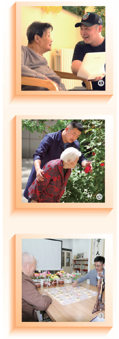 图③:黑龙江省佳木斯市向阳区乐颐老年养护中心负责人石禹(右)陪老人下象棋。
