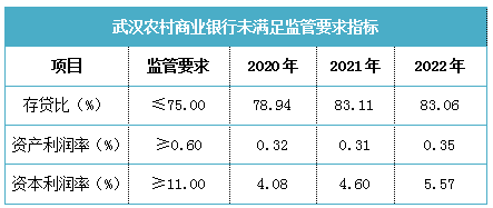 值得关注的是,武汉农村商业银行还有多个指标未满足监管要求。其中,为防范兑付风险,存贷比(银行贷款总额/存款总额)的监管要求为≤75%,2020-2022年,武汉农村商业银行的对应值均在80%左右;盈利能力方面,监管要求资产利润率(税后净利润与平均资产总额之比)和资本利润率(税后净利润与平均净资产之比)应分别不低于0.6%和11%,武汉农村商业银行2020-2022年对应数据分别在0.3%左右和5%左右。