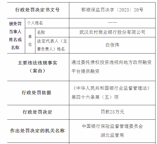 日前,湖北银保监局官网发布的信息显示,武汉农村商业银行股份有限公司(以下简称武汉农村商业银行)因通过委托债权投资违规向地方政府融资平台提供融资,被湖北银保监局罚款25万元。处罚依据是上述行为违反《中华人民共和国银行业监督管理法》第四十六条第(五)项,即严重违反审慎经营规则。处罚并未公布具体案由。