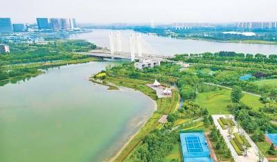 郑州市郑东新区东运河公园碧波荡漾、绿树成荫(6月5日摄)。近年来,郑州市大力建设公园游园,改善人居环境。河南日报记者 聂冬晗 摄