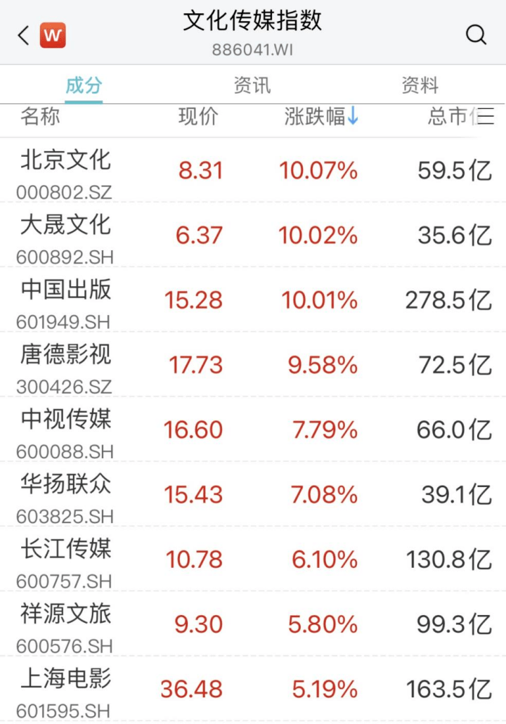 文化传媒股继续活跃,天地在线4连板,北京文化、大晟文化涨停,中国出版、唐德影视涨超9%,中视传媒、上海电影、元隆雅图等跟涨。