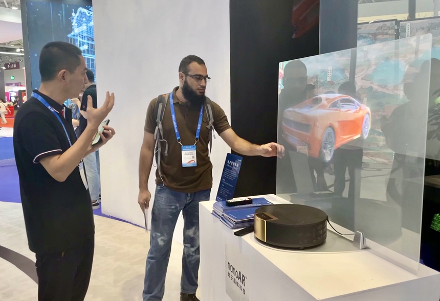 光子晶体展位上的透明电视播放着汽车模型,浮空而立体的视效吸引了巴基斯坦的建筑设计师侯赛因·萨达姆(Hussain Saddam)驻足咨询;