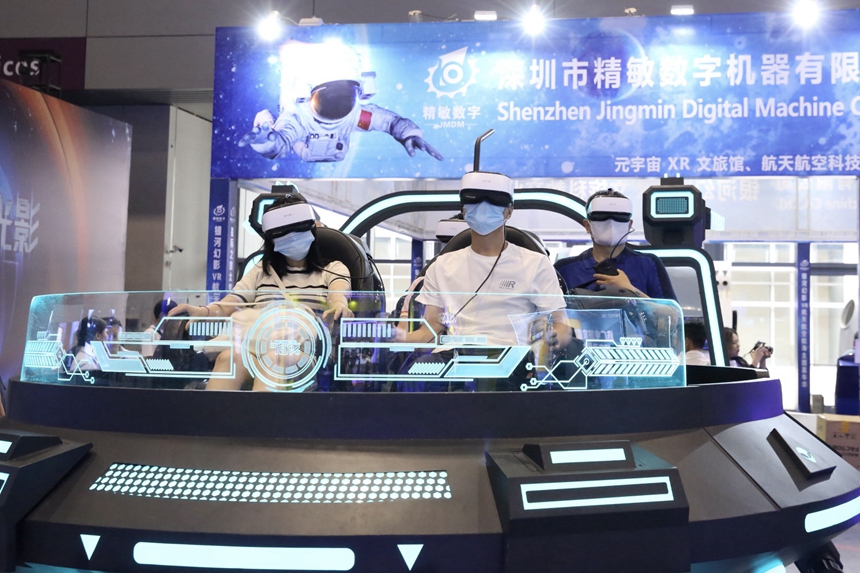 福田展区,月球、火星着陆区虚拟实境系统前的体验观众络绎不绝;光明展区,一款VR直播相机让绿幕前的主播置身宽阔展厅;华强方特分会场,多款元宇宙VR游戏让人欲罢不能……
