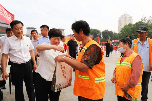 虞城县环卫工人(着黄马甲者)领取粽子。贾震 摄