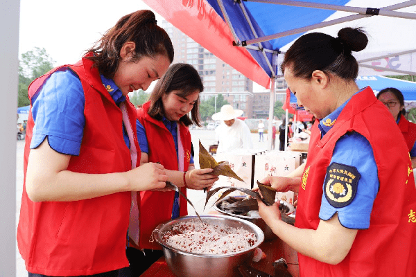 虞城县城管部门志愿服务人员在为现场群众包制粽子。贾震 摄
