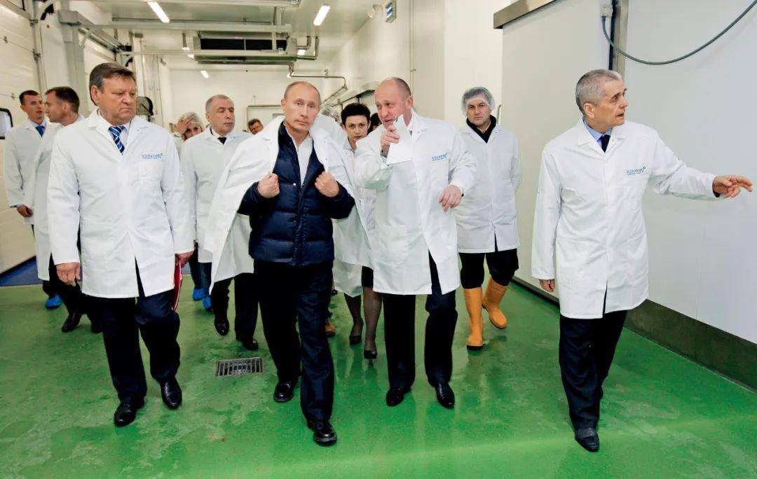 2010年9月20日,普京视察俄罗斯列宁格勒州康科德食品厂,食品厂生产线总经理普里戈任(前右二)等人陪同。图/视觉中国
