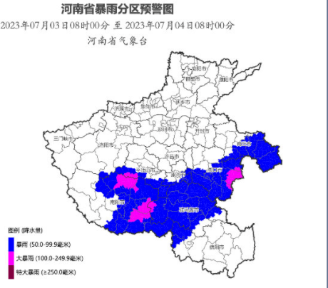 预计7月3日8时至4日8时, 南阳北部和东部、平顶山南部、漯河东部、驻马店、信阳西北部、周口、商丘东部部分县市将出现暴雨(50~80毫米),其中 南阳北部和东部、平顶山西南部、周口东部个别站点雨量可达100毫米以上,并伴有雷电、短时强降水(50~80毫米/小时)、雷暴大风等强对流天气。请注意防范。上述地区的相邻县市(区)也需关注。
