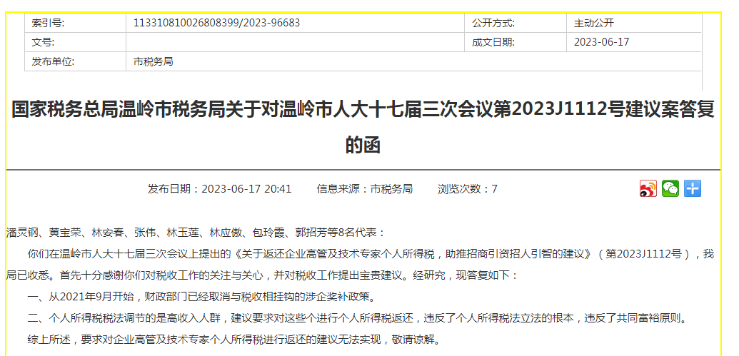 国家税务总局温岭市税务局6月16日答复温岭市人大十七届三次会议潘灵钢、黄宝荣、林安春、张伟、林玉莲、林应傲、包玲霞、郭招芳等8名代表《关于返还企业高管及技术专家个人所得税,助推招商引资招人引智的建议》称,从2021年9月开始,财政部门已经取消与税收相挂钩的涉企奖补政策。此外,个人所得税税法调节的是高收入人群,建议要求对这些个人进行个人所得税返还,违反了个人所得税法立法的根本,违反了共同富裕原则。综上所述,要求对企业高管及技术专家个人所得税进行返还的建议无法实现,敬请谅解。