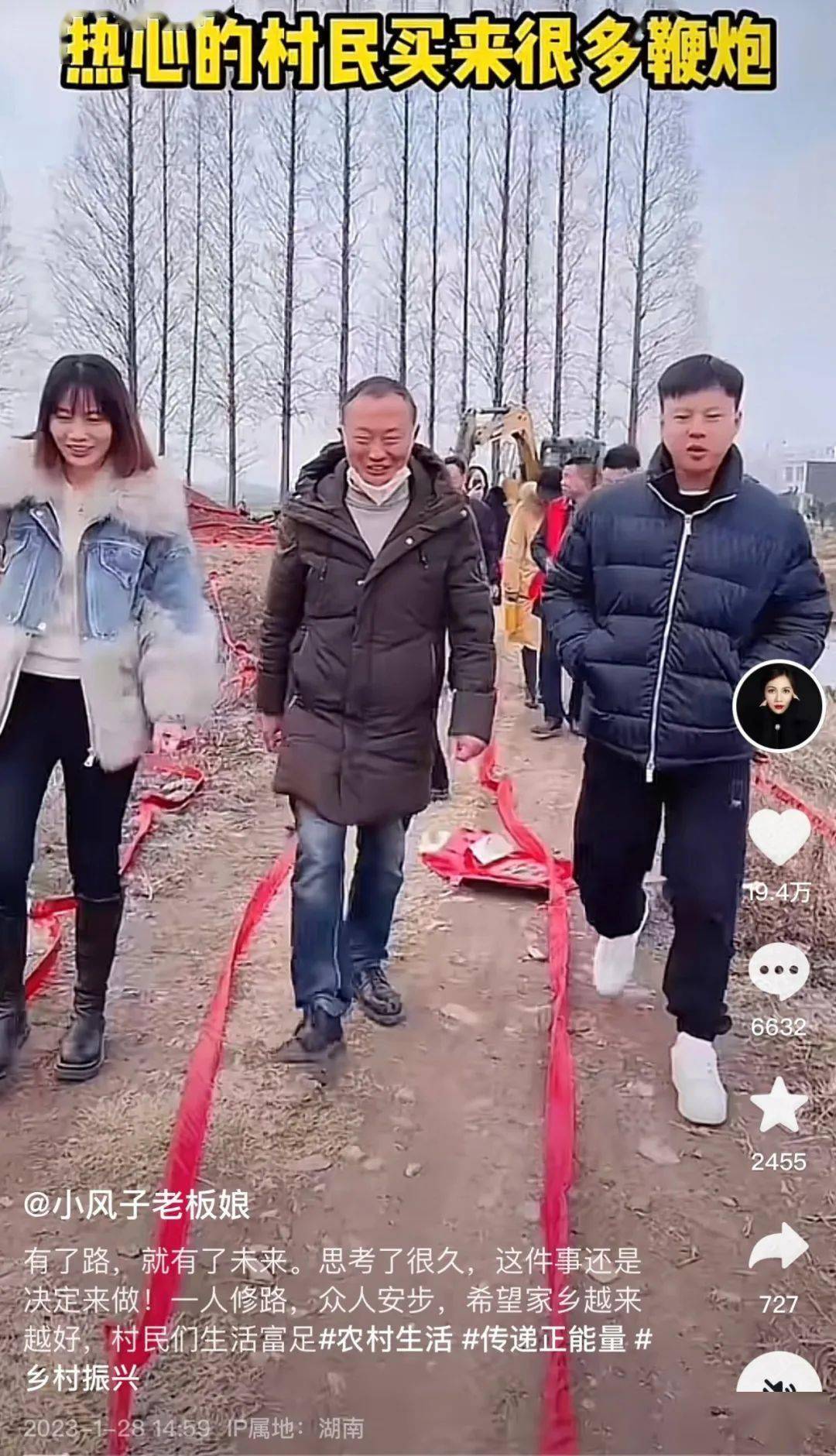 同一时间,湖南常德安乡县的一个小村子里,有一条3米宽、3公里长的村路车来车往。路是几个月前刚修好的,跟原来的泥水路不同,白晃晃的,猛地一看还有些不适应。村里人都很乐意介绍这条路的故事,当他们开始讲述时,“小风子老板娘”和“陈锋”两个形象便交汇在一起,形成关于一个好人的完整叙事。