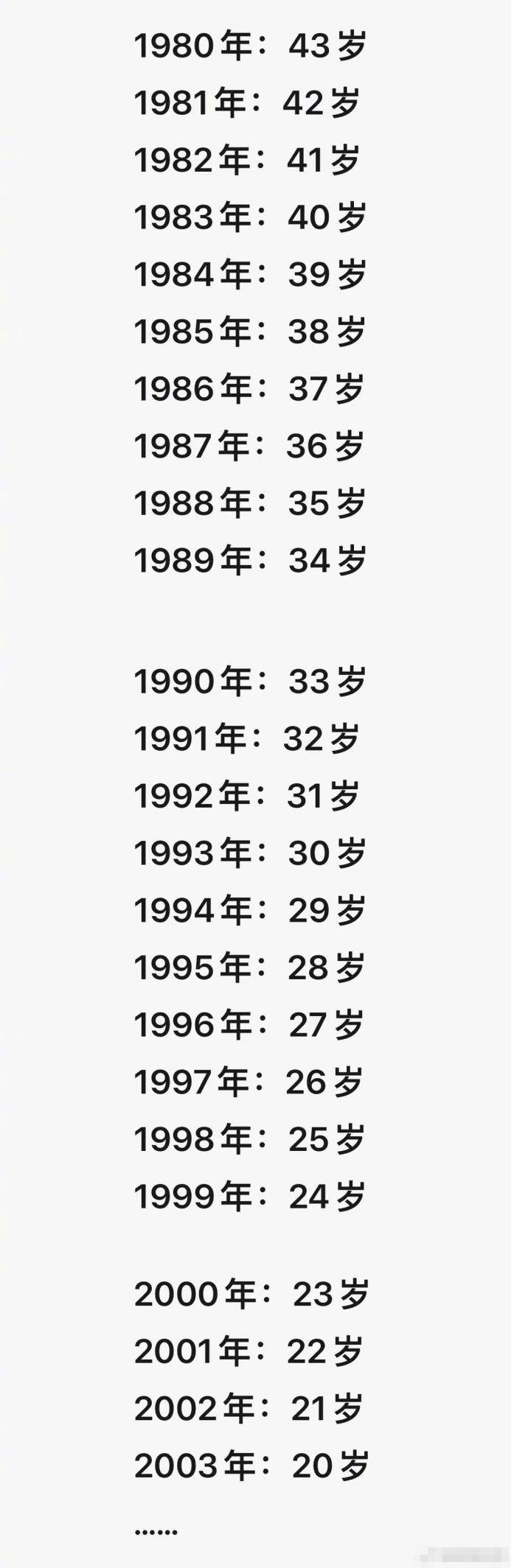 一位“热心”的网友做了一个出生年份和年龄的对照表,提醒大家最大的90后已经33岁了,最大的00后已经23岁了。至于70后、80后,已经不在统计范围之内了。